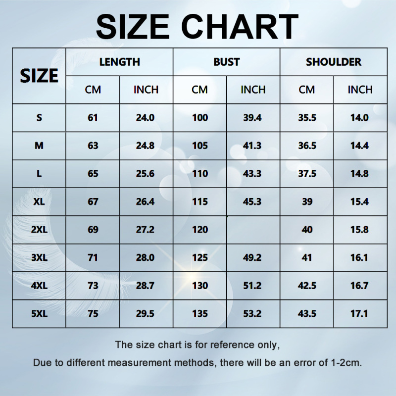 • Sizes: S, M, L, XL, XXL, XXXL, XXXXL, XXXXXL. Please calculate your size from the measurement chart.