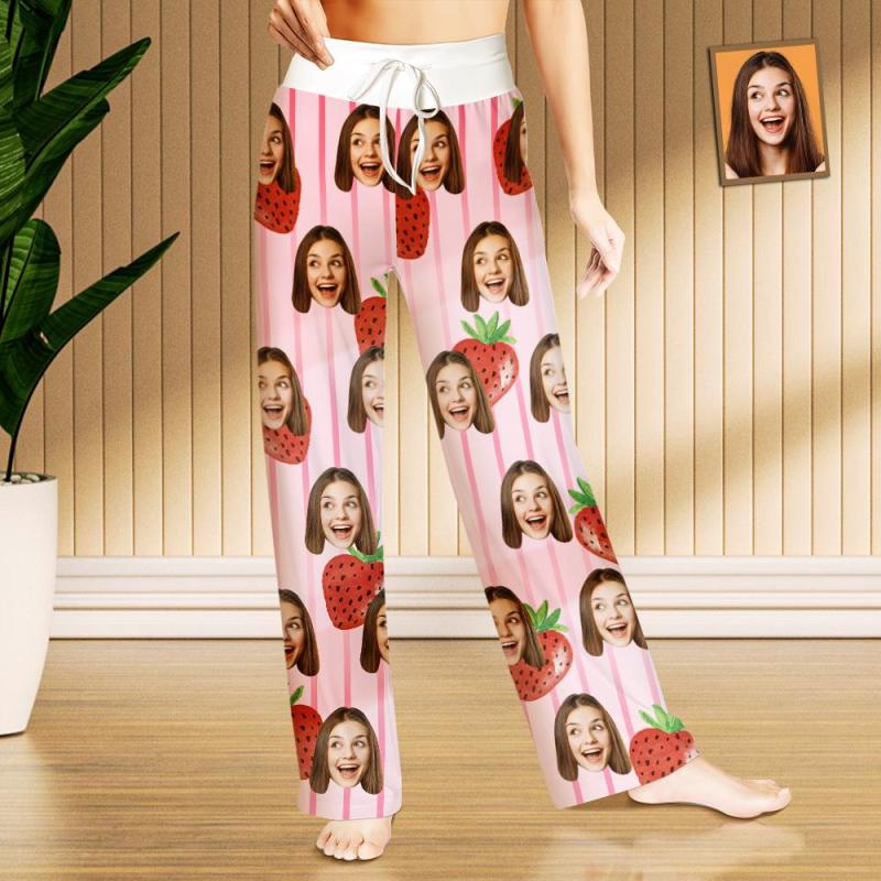 Custom Face Sleepwear Ladies Loose Wide-leg Pants Striped Strawberry Pajama