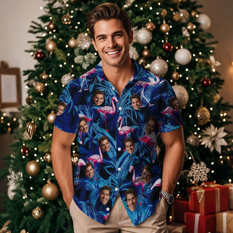 Accueil / Custom Blue Leaf Flamingo Personalized Face Hawaiian Shirt Photo Hawaiian Shirt