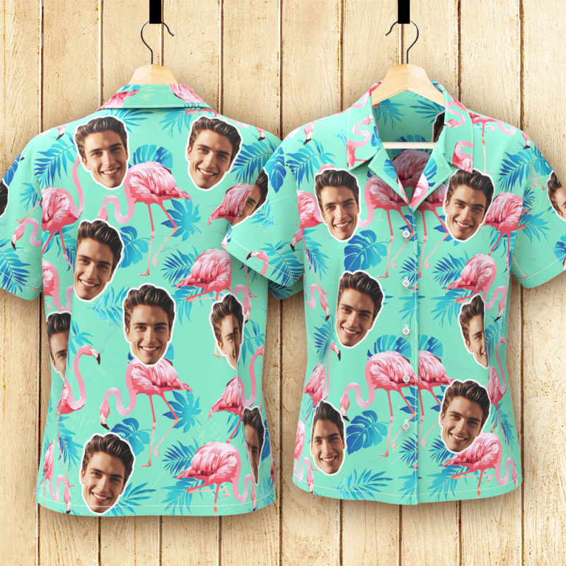 Custom Face Hawaiian Shirt Flamingo Tropical Shirt For Women ALL Over Printed Green and Palm Leaves