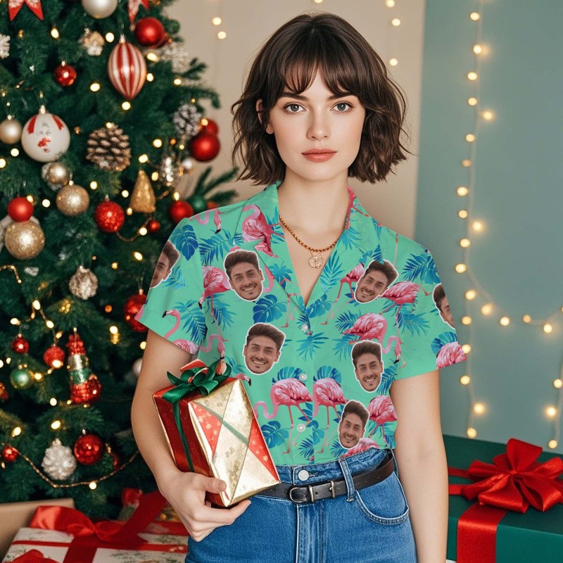 Laman utama / Custom Face Hawaiian Shirt Flamingo Tropical Shirt For Women ALL Over Printed Green and Palm Leaves