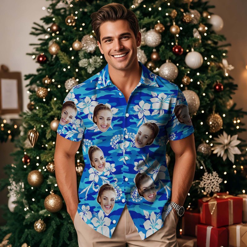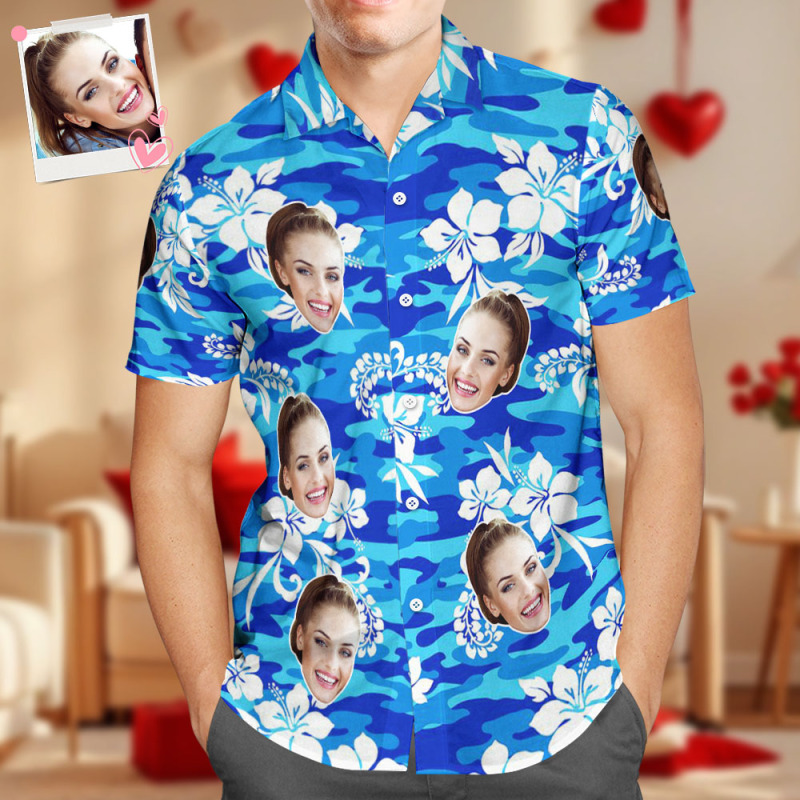 Custom Hawaiian Shirt Tropical Floral Hawaii Shirt All Over Print Face White Flower Blue Shirt