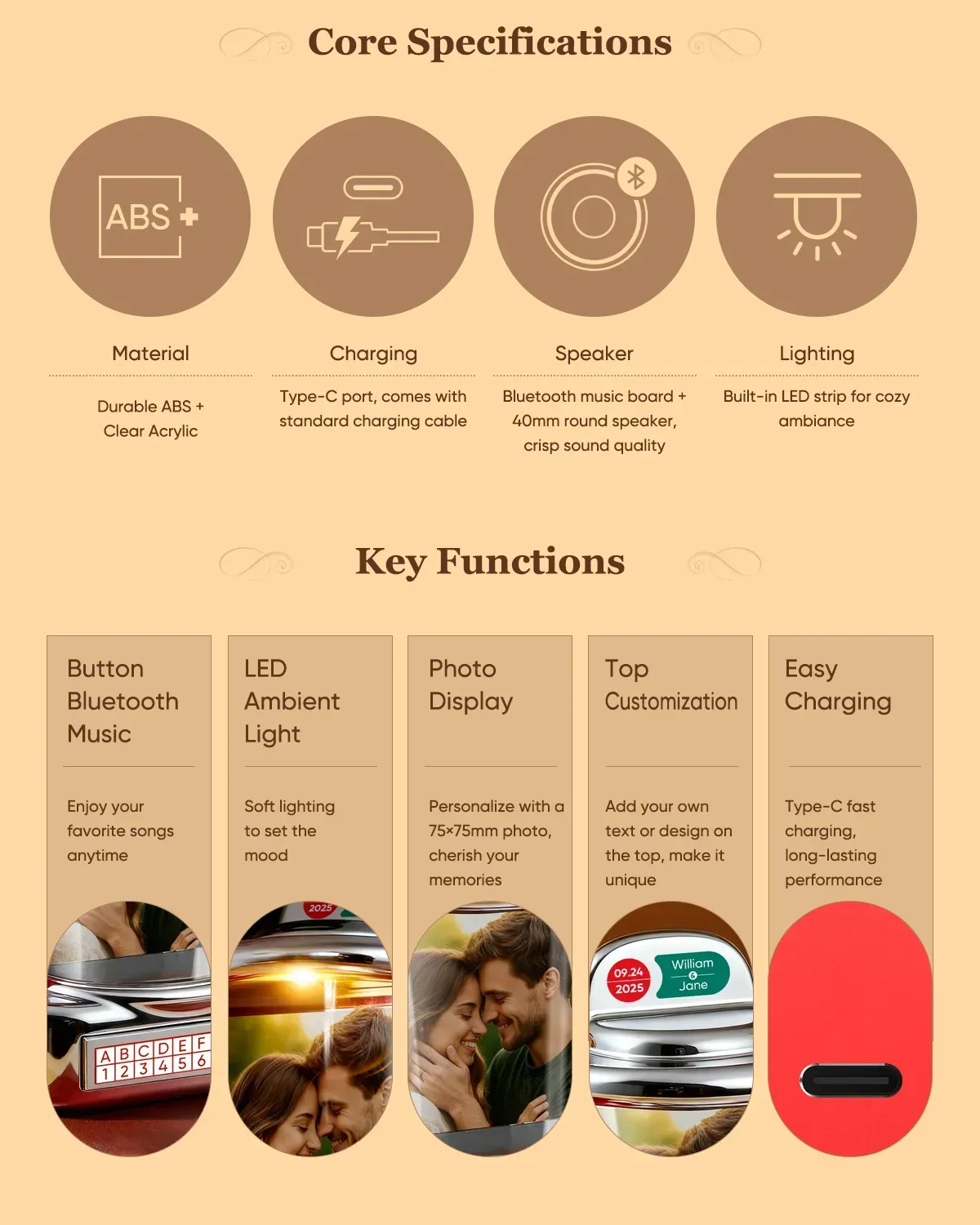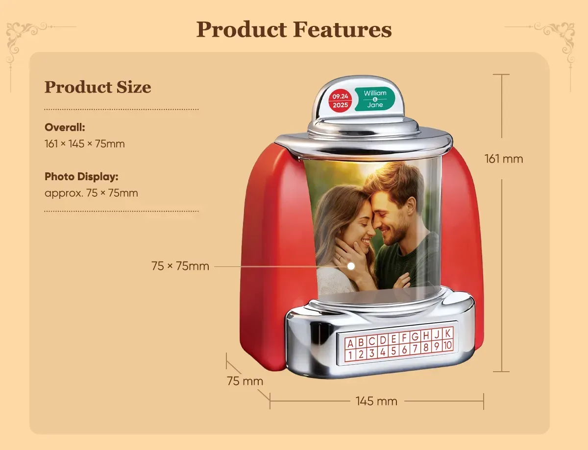 🎵Custom Music & Photo-Add your favorite songs or playlists. Display your chosen photo on the jukebox front.1song or 2 Songs.