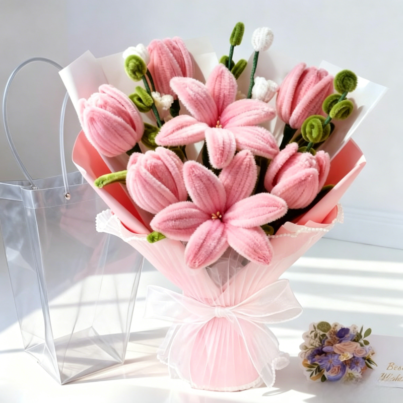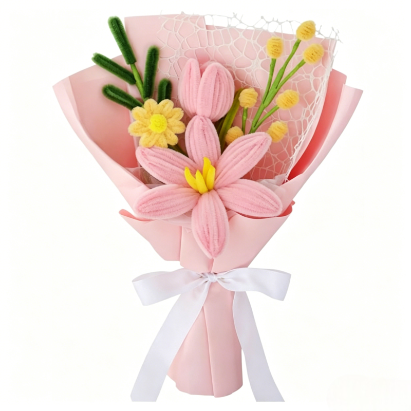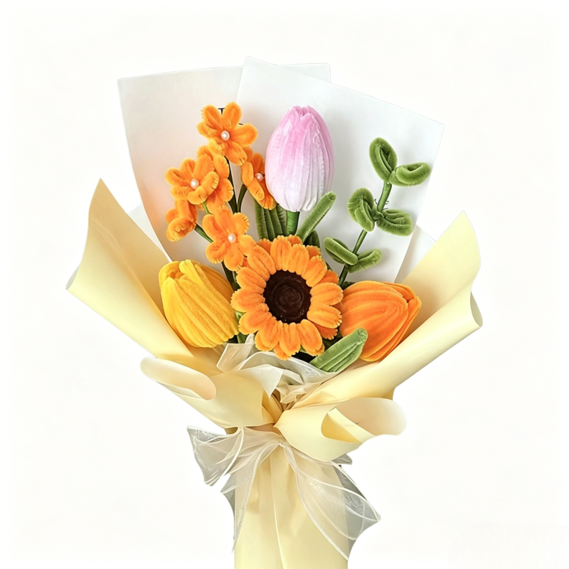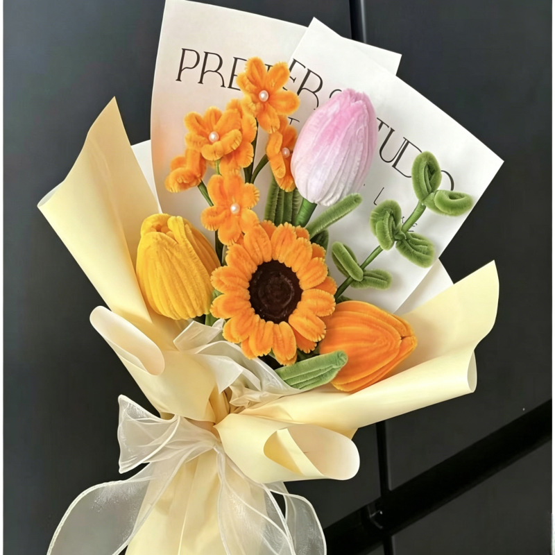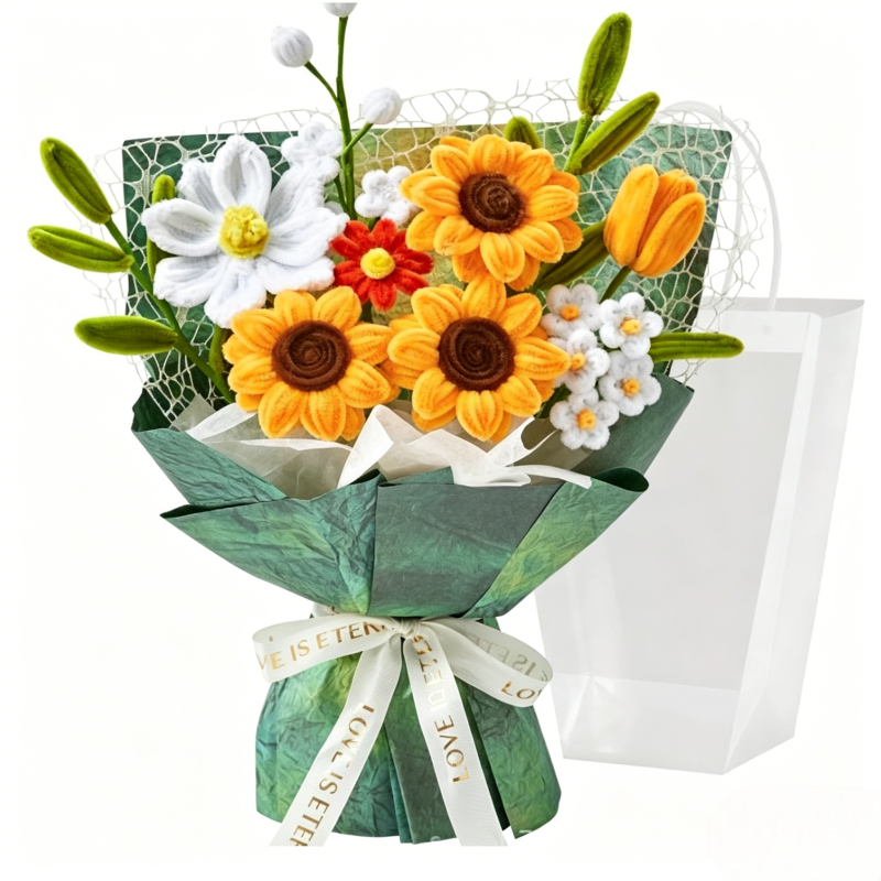 Brighten any space with the Handmade Twisted Stick Sunflower Bouquet – a cheerful, everlasting floral arrangement crafted entirely from soft chenille stems (also known as pipe cleaners or twisted sticks). Each sunflower is meticulously hand-twisted and shaped, then gathered into a charming bouquet that never wilts, needs no water, and brings year-round sunshine to your home.